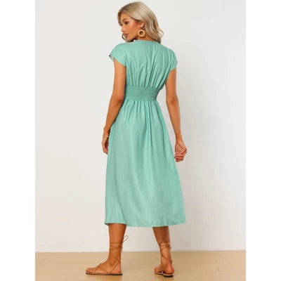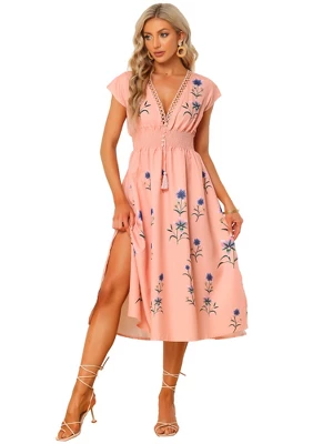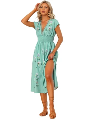 - Midi Length, Cap Sleeve, Side Slit, Boho Style