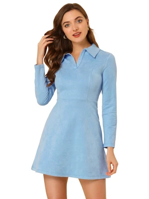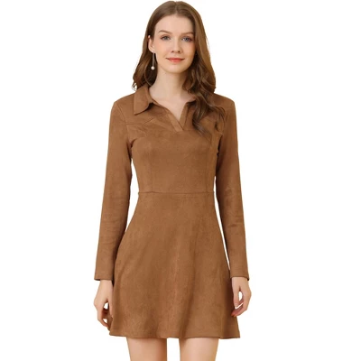 This faux suede dress is perfect for fall and spring, which is simple and fashionable. This a-line dress features faux suede, a lapel neck, long sleeves, a side zipper. Designed for a close fit, it’s high waist design that shapes your waistline. The V neckline leaves a charming look. Team it with anything from classic black pumps to knee boots.