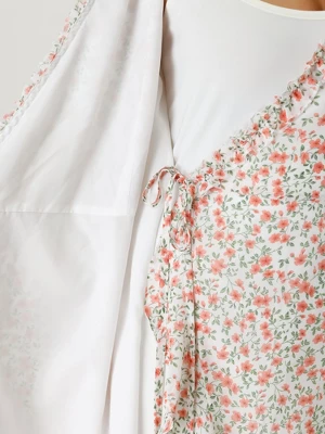 - Ruffle Sleeveless, Floral Print, Ruffled Hem, V Neck, Self Tie Belt, Ruffle Cuff, A-Line, Wrap Style, Chiffon