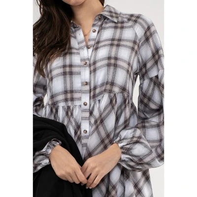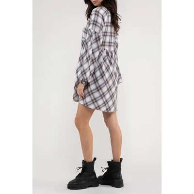 Introducing our August Sky Women’s Plaid Babydoll Mini Shirt Dress, a charming blend of vintage-inspired style and contemporary flair. This dress features a classic point collar and a front button-up closure. The dropped shoulders add a relaxed and laid-back vibe, while the long balloon sleeves with elastic at the openings provide a touch of whimsy. The eye-catching checkered plaid adds a playful and trendy element to the dress. With its babydoll silhouette and mini length, this dress flatters all body types and is perfect for any type of casual occasion. Pair it with booties or cowboy boots for a perfect easy outfit.
