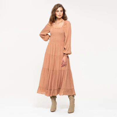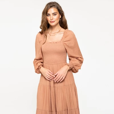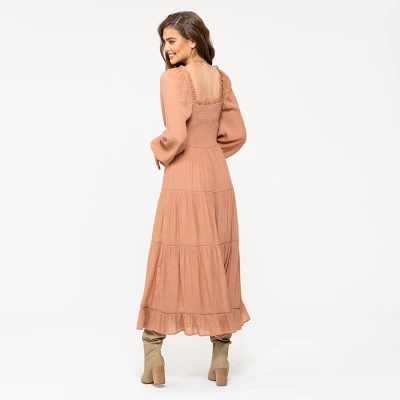 This August Sky dress can be worn year round. Featuring a square neckline with ruffle detailing and balloon sleeve with smocked wrists. It is a 3-tier lined dress for comfortable wear and elastic waistline for a more flattering silhouette. The fabric is a breathable, lightweight rayon gauze blend. From day events to weekend gatherings, this dress is a great addition to your wardrobe. This dress can easily transition from a bump friendly maternity dress to something you can easily pull on for a special occasion. Pair with heel or boots and complete the look with your favorite accessories.