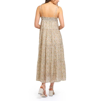 This August Sky women’s maxi dress is the perfect throw and go dress. Lightweight, flowy, and easy to layer. It features an all over floral print, smoking around the upper bodice of the dress, a tiered skirt, and spaghetti straps for a cool comfortable wear. Imagine taking this one to our next tropical vacay. Pair it with your favorite sandals or wedges to complete the look.