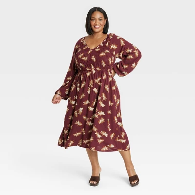 Elevate your outfits with this Balloon Long Sleeve Smocked Midi Bodice Dress from Ava & Viv™. This balloon long-sleeve dress fashioned in a midi length features a flattering V-neck and a smocked bodice for a touch of dressy texture and style. The midweight woven material offers you a comfortable drape, while the pull-on design allows for ease of wear. Complete the look with your choice of footwear and hoop earrings.